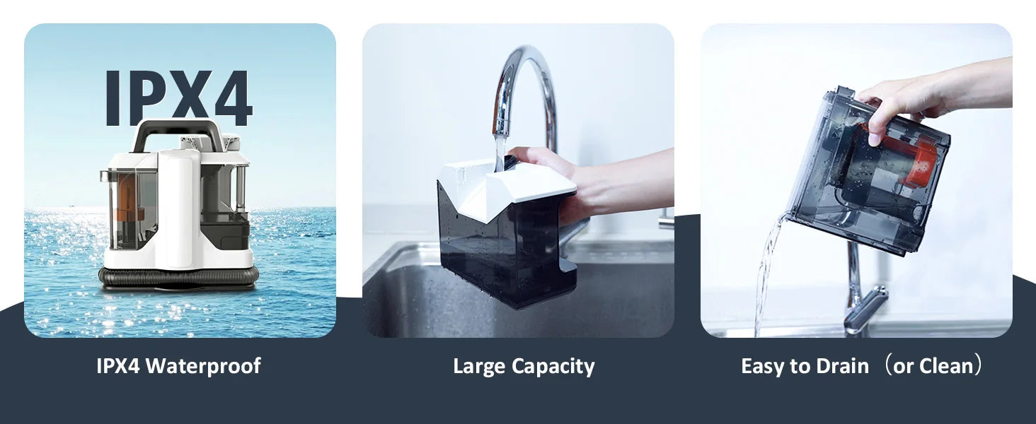 2. MOCNE SSANIE: Wysokociśnieniowy strumień wnika głęboko we włókna, silne ssanie wyciąga brud i płyny, zapewniając szybkie suszenie, usuwa resztki jedzenia i rozlane płyny, plamy i zapachy, głęboko osadzony błoto i brud